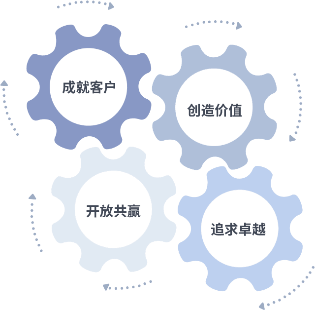 成就客户是一切决策的出发点,,创造价值是衡量所有工作的标准,,,追求卓越是我们做事做人的态度,,,,开放共赢是我们的格局也是最终的结果。。价值观的齿轮环环相扣,,,,推动着组织里的每个人不断向前。。。。